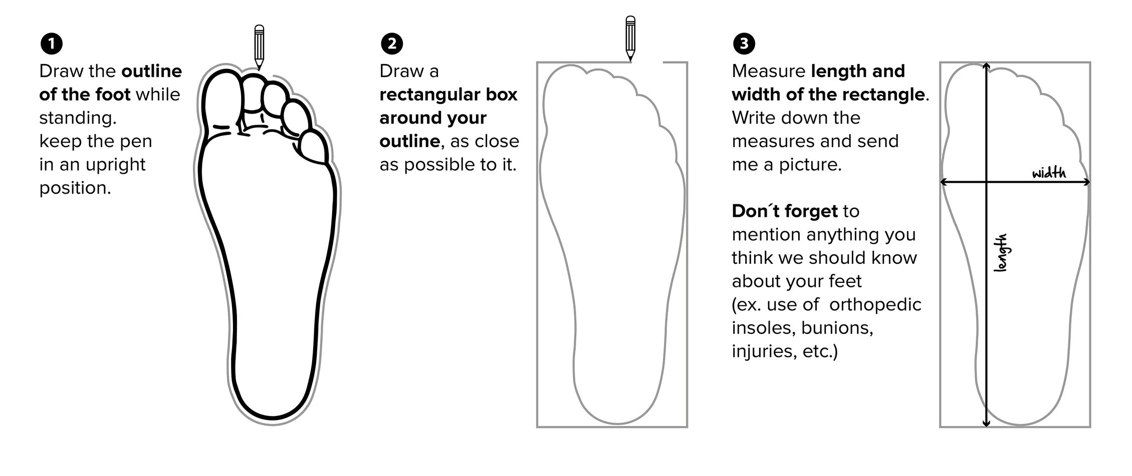 The best thing to do is to draw an outline of your foot, and then draw a rectangular box around it. If you then give us the measurements of the width and length of your foot we can advise you best that way! See the “step by step” image below.
